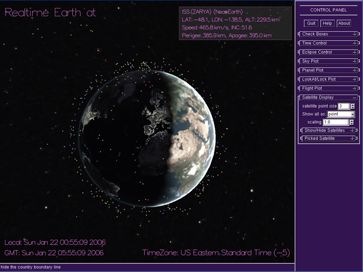 earthDay focuses on exploring the spatial environment surrounding the Earth, and provides a variety of ways of looking at the Earth, the moon, the artificial satellites, and the planets on a particular day at a particular time.